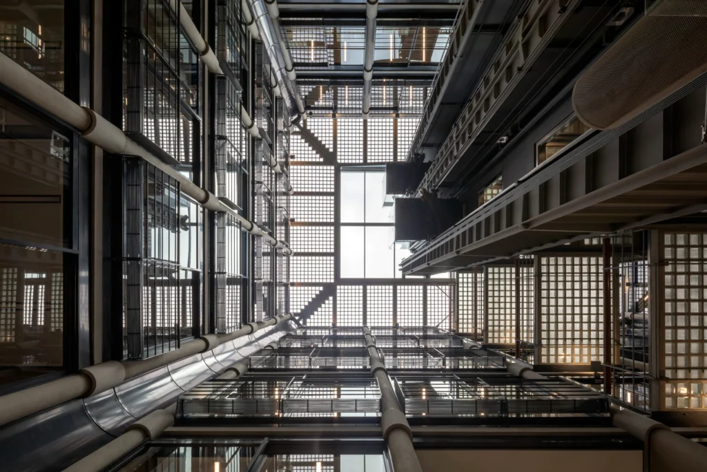 The distinctive lift bank sitting at the centre of the atrium is constructed of exposed concrete, gunmetal painted steelwork and glass blocks to floors and roof. The architects have sensitively replaced the central section of roof with full glass panels flooding the otherwise faithfully maintained area with natural light.