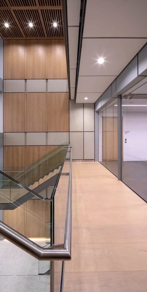 Another transformation is the new ceiling and lighting, providing bright working areas. Old 1980s fittings are replaced with the latest contemporary, seamless, linear LED fittings. These are now running towards the perimeter, rather than parallel to the facades, helping to better express the radial geometry of the Hopkins office floors. Sensitive contemporary circular fittings have been used for the wings, similar to the original arrangements.