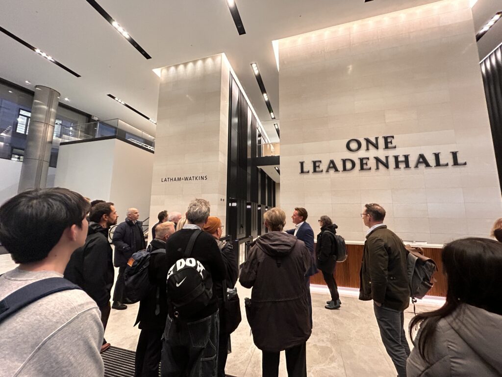 Image courtesy of Make Architects On a sun-drenched afternoon in early April, members of the City Architecture Forum filtered through the thirsty Leadenhall Market to arrive at an exclusive tour of 40 Leadenhall. A striking and unavoidable new presence on the City’s skyline and one of the most ambitious commercial developments to emerge in the Square Mile in recent years. Once dubbed ‘Gotham City’, 40 Leadenhall commands attention not with height alone, but through the boldness of its architectural language: a series of layered volumes stepping skyward with geometric poise; aptly bookending the cluster. Designed by Make Architects and developed by M&G Real Estate with Nuveen Real Estate, the scheme delivers over 900,000 sq ft net of high performing office space across a dynamic, and a tiered form providing many outdoor spaces (17 to be precise). The tour, guided by Cara Bamford of Make Architects and Andrew Todman of Gleeds (formerly Avison Young), presented a rare opportunity to step inside this landmark and gain an intimate insight into the project’s vision, complexity, and delivery. From the ground up The group gathered at the building’s generous north entrance where light danced off orthodox façades and crisp lines invited the eye upward. Already, the building makes a statement, not just as a feat of scale, but as a symbol of modernity rooted in context. The structure sits comfortably among the City’s evolving ensemble of towers, yet carves out its own identity through thoughtful massing, refined materiality, and intelligent urban response – almost naturally integrating with the history of the streets. Our hosts began the tour with an overview of the site’s history, the constraints and opportunities of its central location, and the conceptual principles that shaped the architectural form. It quickly became evident that this was not simply a tall building; it is the result of laborious design thinking, strategic collaboration, and confidence in the city, even with COVID-19 shutdowns looming upon breaking ground. Tall oaks from little acorns grow As we moved through the internal spaces, Cara described the design team’s ambition to create a new model for high density and high-quality workplace environments. The tiered form not only creates a dramatic external silhouette, it responds to light, views, and urban grain, preserving key sightlines while allowing natural daylight to permeate deep into the floorplates. Inside, the sense of volume is palpable, with the receptions boasting up to 8.5m of floor-to-ceiling height space. Consistent and expansive floorplates offer flexibility for a range of occupiers, while triple-height spaces and high-performance glazing create a feeling of openness rarely found at such a scale. The internal planning reflects contemporary demands for adaptability, wellness, and energy efficiency. Every decision, from materials to mechanical systems, has been approached with performance and longevity in mind. For instance, the floorplate had been designed to split into three, yet out of the 34 storeys, only two have taken this route – which is testament to the obsession of open-plan and the scale of tenancy. Principle project management Andrew then brought the conversation into the realm of project management and delivery. From what appears to be back-to-front procurement strategies to construction logistics, he shared the challenges of carrying a project of this magnitude in the heart of one of the world’s busiest business districts, and how the unique order of packages enabled a much tighter programme in the long-run. He spoke to the sheer complexity of the build, including the coordination of multiple work streams, the interface with neighbouring structures, and the need for constant collaboration between consultants, contractors, and stakeholders. He offered insight into how the team navigated programme pressures, supply chain dynamics, and technical innovations to maintain momentum and quality throughout. What shone through was a deep commitment to both precision and partnership on the foundation of a digitally native toolkit. The success of 40 Leadenhall is not just a story of architectural ambition, it is a triumph of orchestration, in a scale of bedlam that should not work on paper. Sustainability and the future workplace A core focus of the tour was the building’s sustainability credentials. In a landscape where the environmental performance of new developments is under increasing (and justified) scrutiny, 40 Leadenhall stands as a benchmark. The design prioritises operational energy efficiency, with high-performance façades, intelligent systems, and the ability to adapt to future technological advances. Cara and Andrew both emphasised the long-term thinking embedded in the project. Rather than designing for immediate occupancy alone, the scheme has been crafted to evolve with its tenants; flexibility in services, floor layouts, and building systems means the spaces can adapt as user needs change. This forward-thinking approach reflects a broader shift in how we conceive workplace buildings, not just as static shells, but as living frameworks capable of supporting diverse and sustainable modes of working. The power of perspective Perhaps most compelling was the chance to experience the building at multiple levels. From street to summit, the tour revealed a project in dialogue with its context at every scale. At ground level, generous public realm interventions create a welcoming threshold; mid-rise terraces and setbacks offer moments of pause and reflection; from upper floors, sweeping views across the City underscore the building’s place in the skyline. Not to mention, the beautiful restoration and integration with Grade-II listed heritage building, 19-21 Billiter Street, forming an intrinsic part of the overall development with a restaurant as well as wellness facilities for building users For many attending, the highlight was t