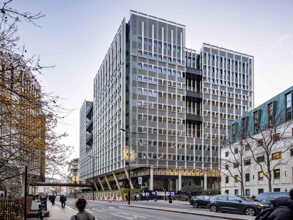 We are sincerely grateful to our hosts and guides, Piers Blewitt, Director of Development Management at Great Portland Estates (GPE), and Artur Carulla, Partner at Allies and Morrison Architects. CAF members and their guests were afforded a rare privilege: visiting the project shortly after practical completion, just days before the end user tenant takes occupancy. Access at this stage has been highly restricted, with even other market agents not yet admitted. On Monday 16 March 2026, the City Architecture Forum hosted a tour of 2 Aldermanbury Square (EC2V 5AU), a major new 320,000 sq ft office development designed by Allies & Morrison and built by Bovis. Fully pre-let to magic circle law firm Clifford Chance, the building replaces City Place House and delivers almost double the previous floor area through a more efficient structural design, increased height and carefully engineered oversailing of the public highway. This new office building replaces an obsolete 1980s office block that was unsuited to contemporary work modes, had poor environmental performance and was cut off from the ancient public realm of the Square Mile. Detailed life cycle analysis concluded that refurbishment would prove more carbon intensive rather than redeveloping the site to ambitious performance standards. So, our response has been to do just that. Carbon neutral, contextually responsive and achieving a WELL Gold standard, we are delivering one of the most environmentally progressive new buildings in the City of London to date. At 13 storeys, it also includes a new pedestrian link into the pedway network that reaches out to the neighbouring Barbican Centre. As a 13-storey structure in the heart of the City, it provides a high-density, modern presence in the City Core, contrasting with the much smaller 8-storey building it replaces. It is described as a “significant addition” to the London skyline, designed with a focus on high-quality, sustainable office space aimed at attracting top-tier occupiers. The project, which serves as the new global headquarters for law firm Clifford Chance, focuses heavily on sustainability, aiming for a “BREEAM Outstanding” rating and a NABERS 5-star rating. The tour began with twenty attendees gathering at the rear of the building on Basinghall Street, where the project team explained how the new structure rises seven metres higher than its predecessor. Rather than traditional demolition, the former building was carefully de-constructed, with its steel frame later reused in another London development—an approach that significantly reduced embodied carbon. Moving into the impressive double-aspect reception, which opens to both London Wall and Aldermanbury Square, the project architect outlined the building’s structural and environmental strategies, including striking inclined columns that support the cantilevered floors above the public realm. The group then travelled to the level 12 roof terrace, where panoramic views across the City skyline, St Paul’s Cathedral and the South Bank provided a dramatic reminder of the building’s prominent setting. Further stops included an unfinished office floorplate—revealing the raw concrete structure, exposed beams and intumescent-painted steel before fit-out—and the basement level, where generous cycle parking, gender-neutral lockers and shower facilities demonstrate the building’s commitment to modern workplace standards. Combining ambitious structural engineering, strong sustainability credentials and new public routes through the site, 2 Aldermanbury Square represents a significant addition to the evolving architecture of the City of London.