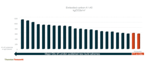 Thornton Tomasetti’s bar chart (below) illustrates embodied carbon figures gleaned from public planning applications for 23 (unidentified) buildings completed since March 2022 – when the London Plan’s targets were set and the requirement to state carbon figures in applications was put in place. Stonecutter in red is at the right-hand end of the graph.