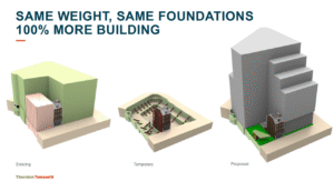 The architectural design and engineering strategy has produced a new building that is twice the size but the ‘same weight’ as its Po-Mo predecessor, partly by using 71% of the existing foundation piles.